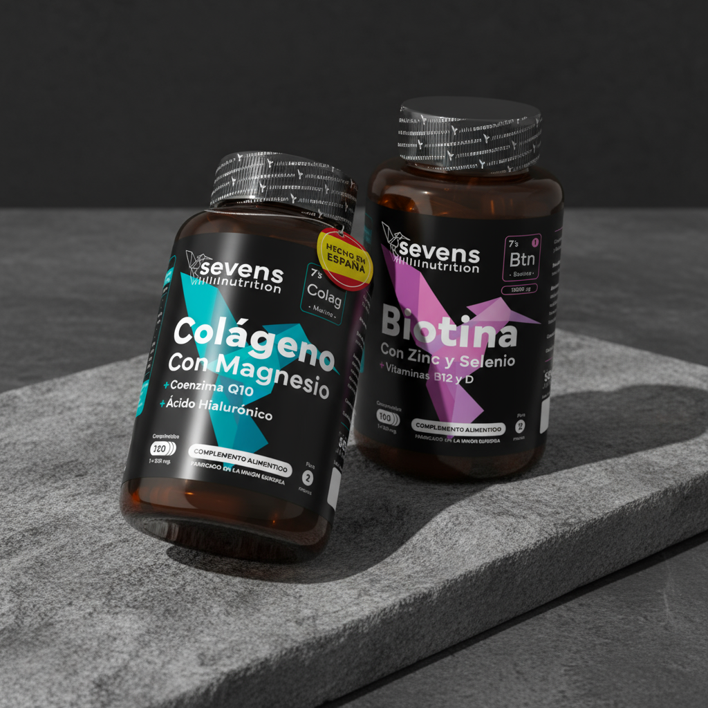 La juventud de la piel se construye desde dentro. Colágeno Sevens aporta colágeno hidrolizado, ácido hialurónico, coenzima Q10 y vitaminas clave que favorecen la firmeza, elasticidad e hidratación profunda de la piel. Esta fórmula estimula la producción natural de colágeno y combate el estrés oxidativo, ayudando a reducir la aparición de líneas finas y mejorar la textura cutánea. En sinergia, Biotina Sevens refuerza la salud celular con biotina, zinc, selenio y vitaminas D3 y B12, contribuyendo a una piel más equilibrada, luminosa y protegida. Juntas, estas fórmulas representan el compromiso de Sevens con una belleza auténtica, saludable y sostenible.