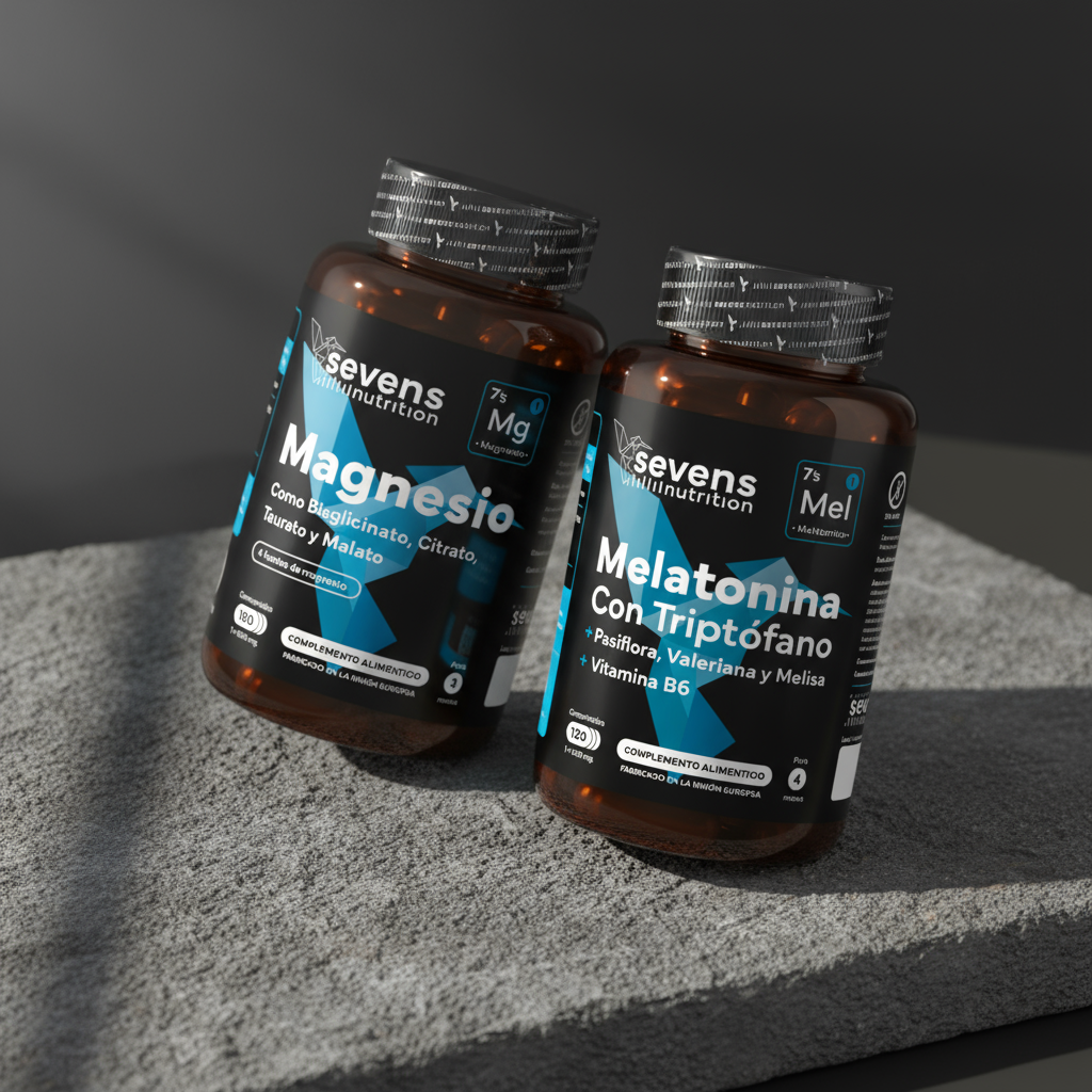 Un buen descanso es la base de una vida equilibrada. Magnesio Sevens favorece la relajación muscular y el equilibrio del sistema nervioso, ayudando a preparar el cuerpo y la mente para el descanso nocturno. Su fórmula con cuatro formas de magnesio altamente absorbibles actúa de manera efectiva para reducir el estrés físico y mental. Combinado con Melatonina Sevens, que incluye melatonina, triptófano y extractos naturales como valeriana, melisa y pasiflora, se facilita el inicio del sueño y se mejora su calidad. Esta combinación trabaja en armonía para ayudarte a dormir profundamente, despertar renovado y sostener un ritmo vital saludable, en coherencia con el enfoque integral de Sevens.