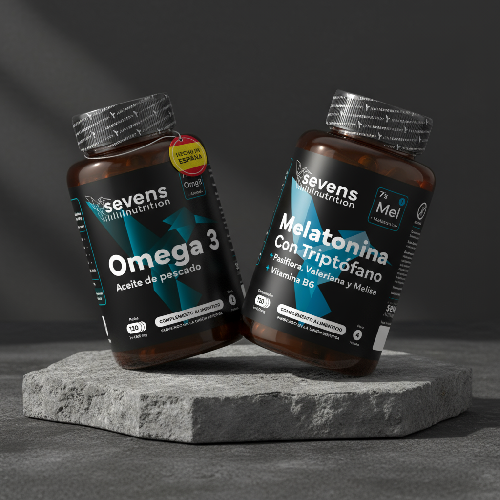 Dormir bien no solo recarga energía, también es clave para tu salud a largo plazo. Melatonina Sevens ayuda a conciliar el sueño de forma natural gracias a su combinación de melatonina, L-triptófano y extractos calmantes como valeriana, pasiflora y melisa, que favorecen la relajación y regulan el ritmo circadiano. Por su parte, Omega 3 Pescado Sevens, rico en DHA y EPA, contribuye al equilibrio del sistema nervioso y al bienestar emocional, dos factores fundamentales para un descanso profundo y estable. Esta combinación actúa de forma complementaria para ayudarte a desconectar, reducir el estrés y despertar renovado, en perfecta sintonía con el enfoque integral de Sevens.