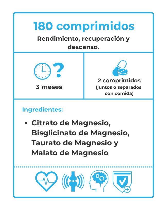 Citrato de magnesio, bisglicinato de magnesio, agente de carga (celulosa microcristalina), taurina de magnesio, malato de magnesio, antiaglomerantes (sales magnésicas de ácidos grasos y dióxido de silicio).