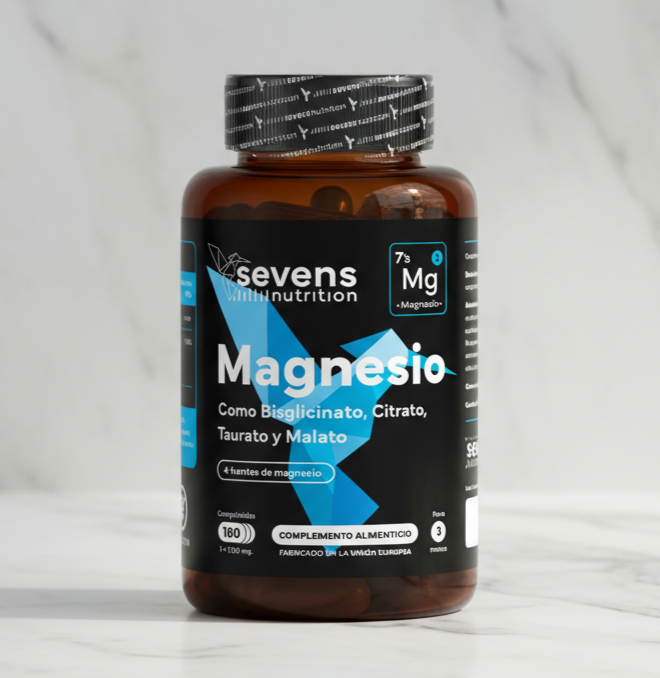 Aquí puedes ver el contenido nutricional de Magnesio Sevens: una fórmula que combina bisglicinato, citrato, malato y taurato de magnesio para mejorar la absorción y potenciar su eficacia.