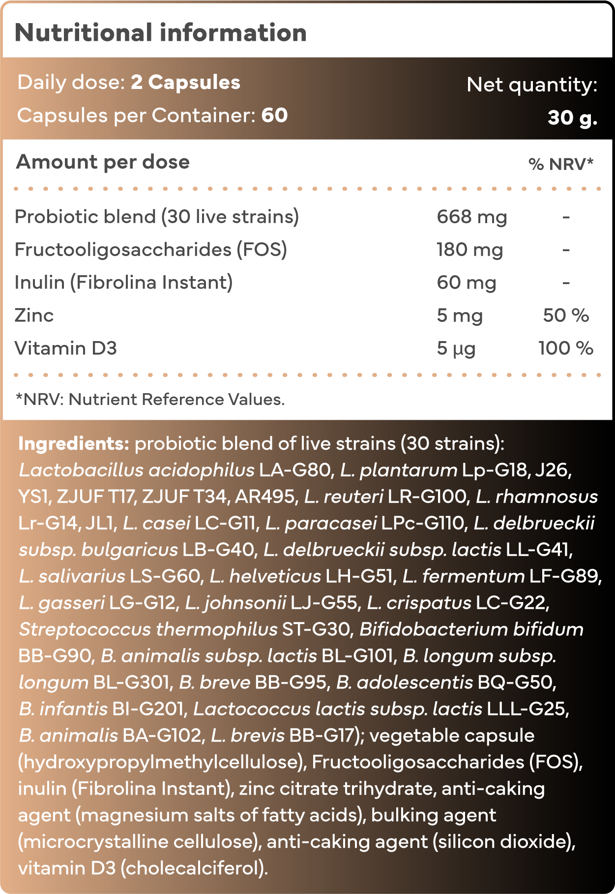 Mezcla probiótica de cepas vivas (30 cepas vivas); fructooligosacáridos (FOS), inulina (Fibrolina Instant), citrato de zinc trihidratado, celulosa microcristalina, estearato de magnesio, dióxido de silicio, vitamina D3 (colecalciferol), cápsula vegetal (hidroxipropilmetilcelulosa).