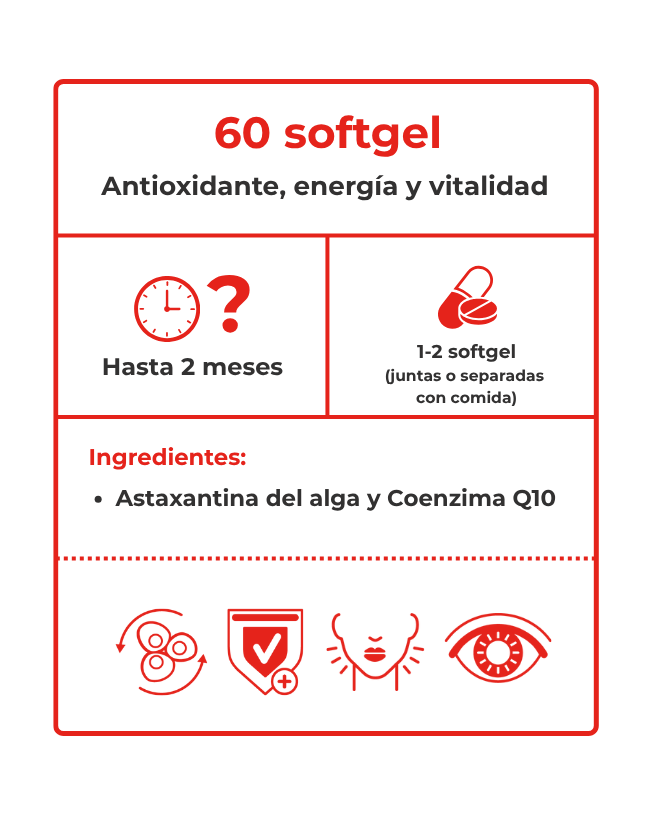 Soporte (aceite de oliva virgen extra), cápsula [gelatina bovina, humectante (glicerina), colorante (óxidos de hierro), agua], coenzima Q10, AstaPure® (oleorresina rica en astaxantina del alga Haematococcus pluvialis).