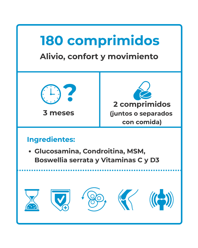 Si te interesa ir más allá de la superficie, aquí te contamos la parte más técnica: la glucosamina y la condroitina son componentes naturales del cartílago que ayudan a mantener su estructura y función. El MSM aporta azufre orgánico, esencial para la regeneración del tejido conectivo, mientras que la Boswellia serrata contiene ácidos boswélicos con acción antiinflamatoria natural.