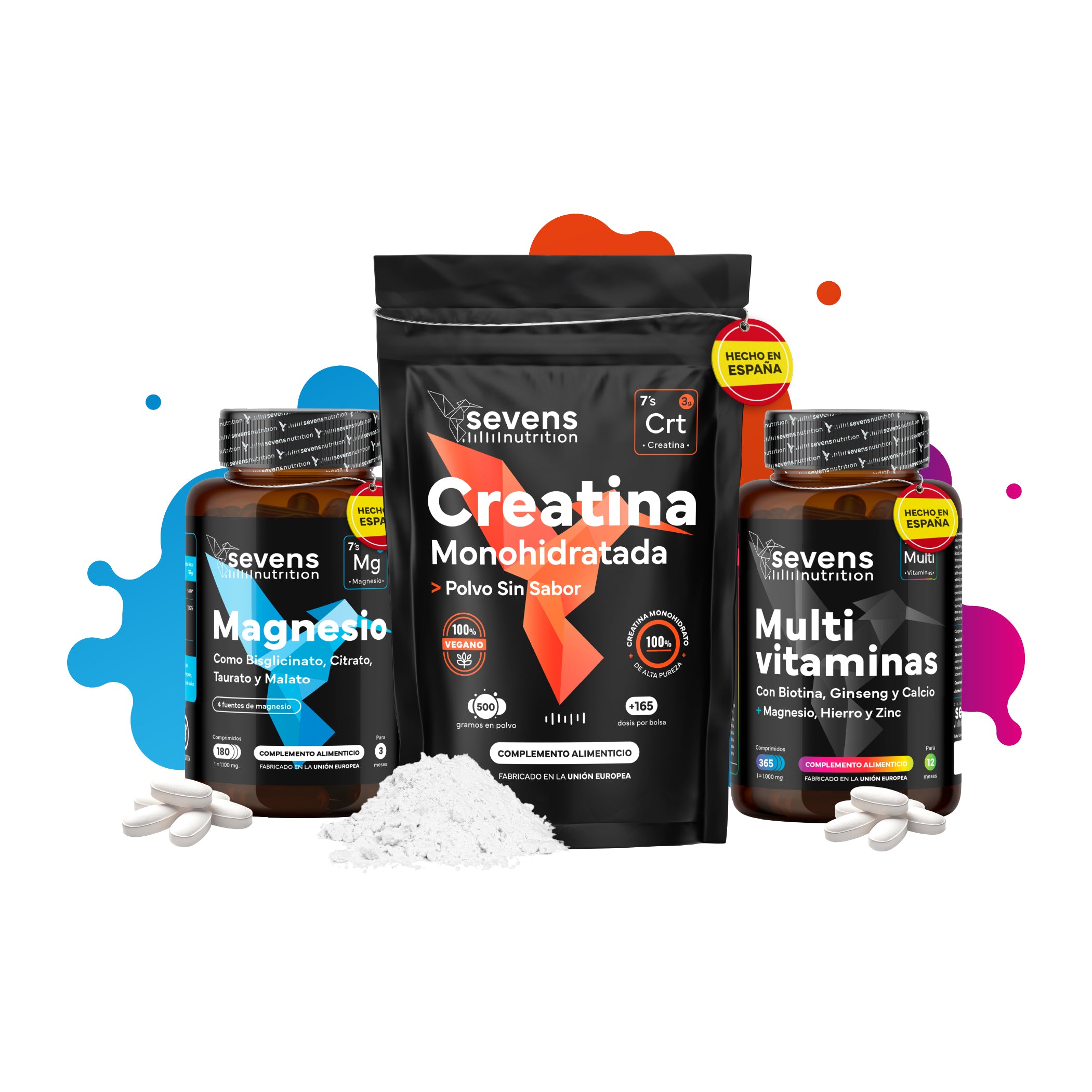This pack combines three key supplements: Creatine Monohydrate , which increases energy production in muscles and improves strength and endurance; Magnesium Citrate , which promotes muscle relaxation and reduces fatigue; and Multivitamin with Ginseng , which provides essential vitamins and minerals to maintain energy and overall well-being.