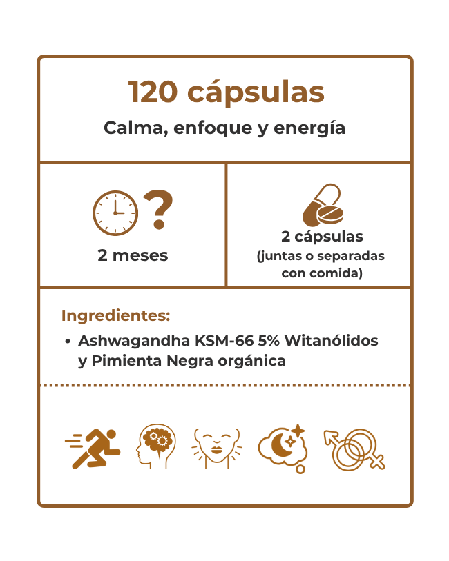Aquí puedes ver el contenido nutricional de Ashwagandha Sevens: extracto estandarizado KSM-66® con un 5 % de withanólidos y Bioperine®, que mejora su biodisponibilidad. Una combinación que actúa directamente sobre el equilibrio del sistema nervioso y hormonal, ayudando al cuerpo a responder mejor al estrés y recuperarse del día a día.