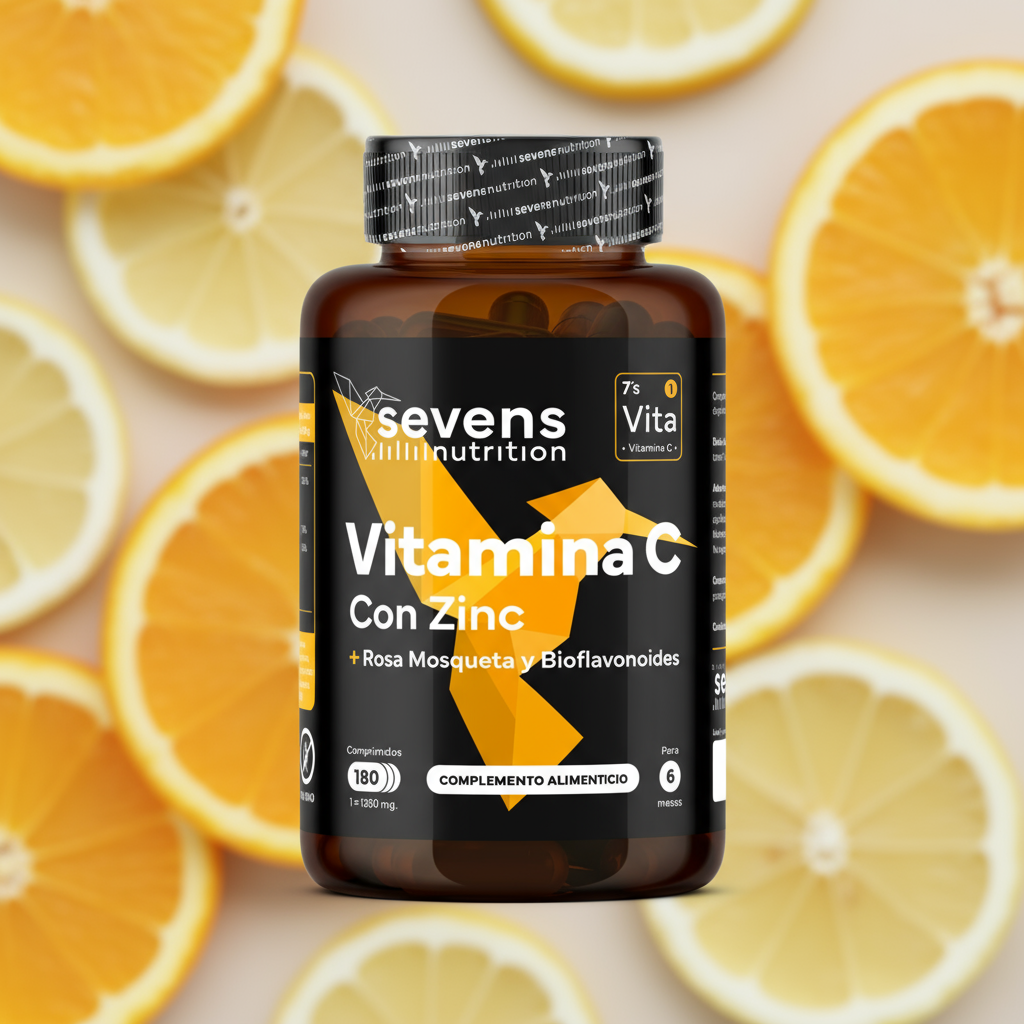 Vitamina C Sevens combina vitamina C pura con escaramujo natural, hesperidina y zinc, lo que potencia la absorción y multiplica su efecto antioxidante.