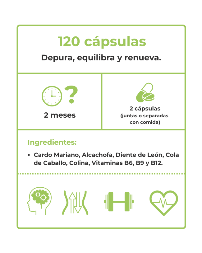 Favorece la eliminación de toxinas y el correcto funcionamiento del hígado, ayudando a recuperar la sensación de ligereza y bienestar