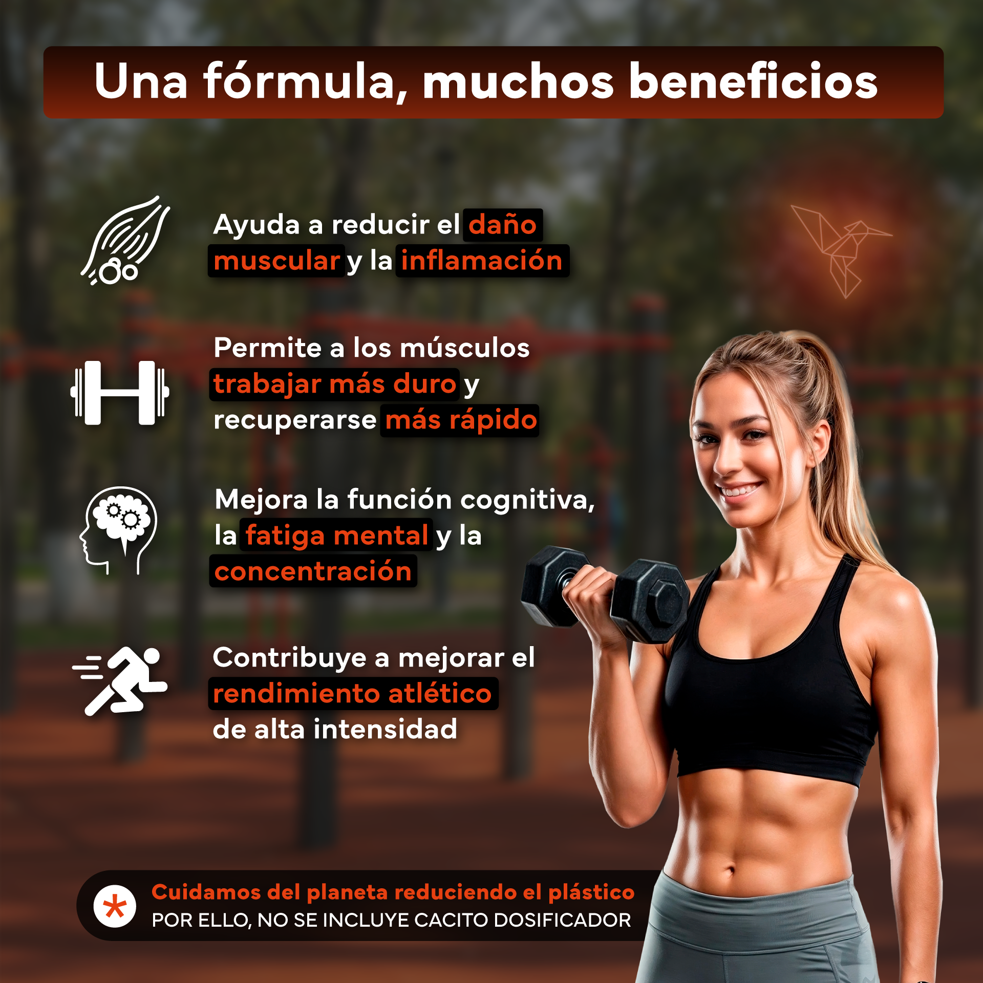 Favorece la recuperación tras el esfuerzo físico, ayudando a reducir el daño muscular y la inflamación provocados por entrenamientos intensos.