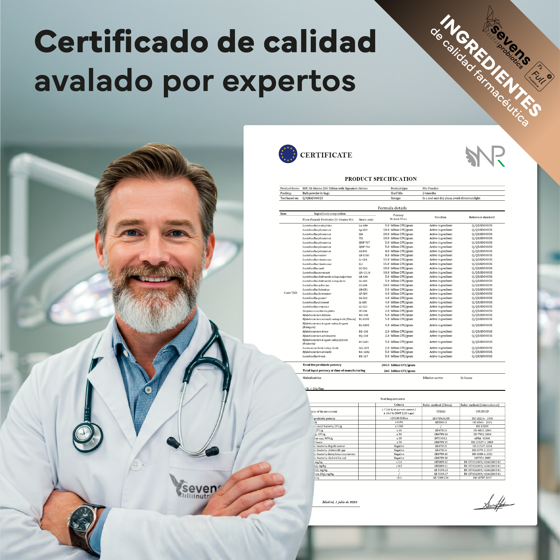 Cada lote se produce siguiendo estándares IFS Food y control de materias primas para asegurar la máxima calidad en cada comprimido.