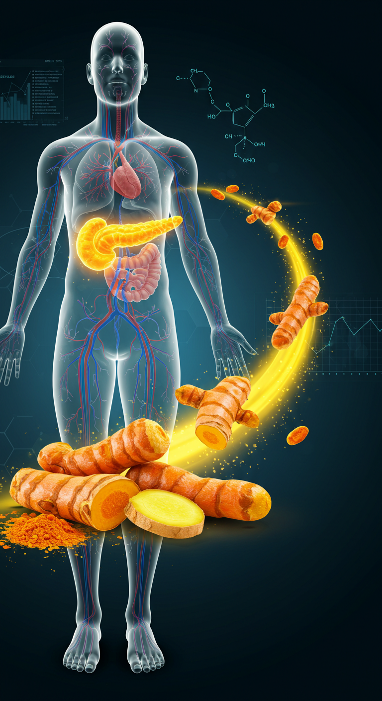 Curcumin improves insulin sensitivity, helping to regulate blood sugar levels. This is particularly useful for people seeking to prevent or manage metabolic problems. The formula is enhanced with ginger, which also has hypoglycemic properties, helping to stabilize glucose levels and reducing the risk of blood sugar spikes.