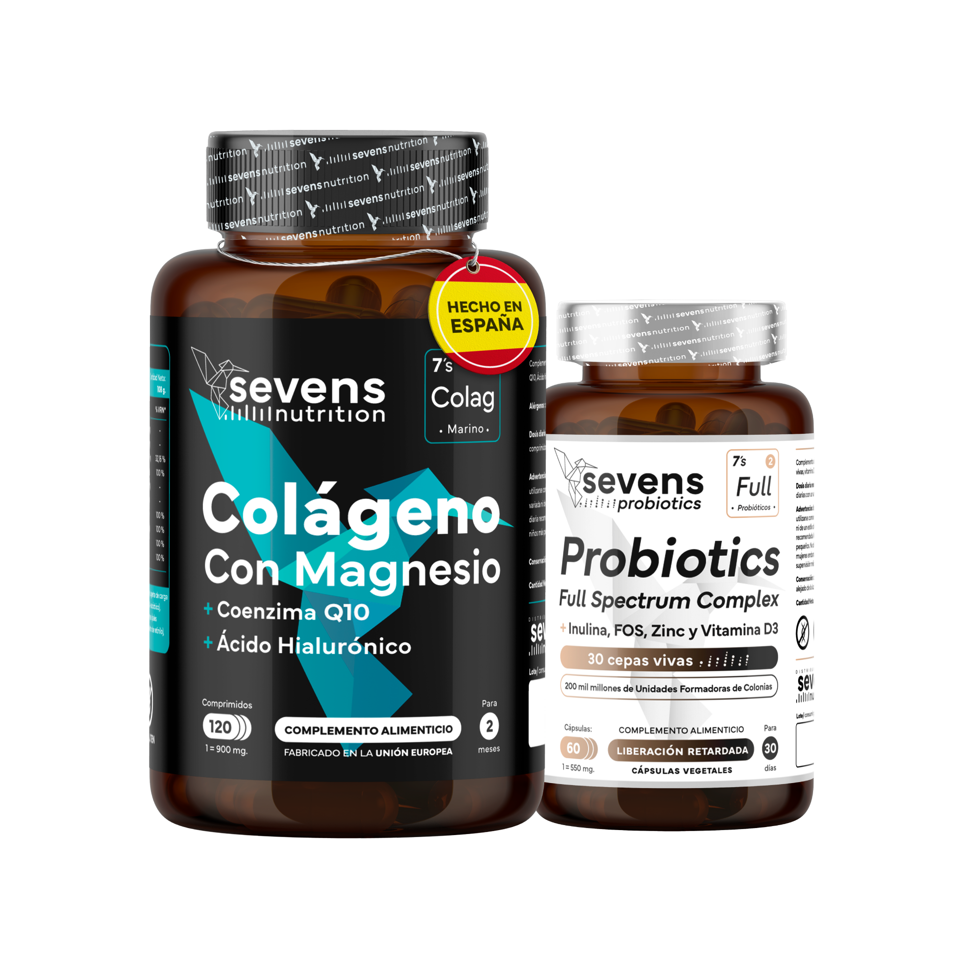 This duo contains Sevens Probiotics and Sevens Marine Collagen , a combination designed to maintain intestinal health, strengthen skin and joints, and promote complete well-being from within.